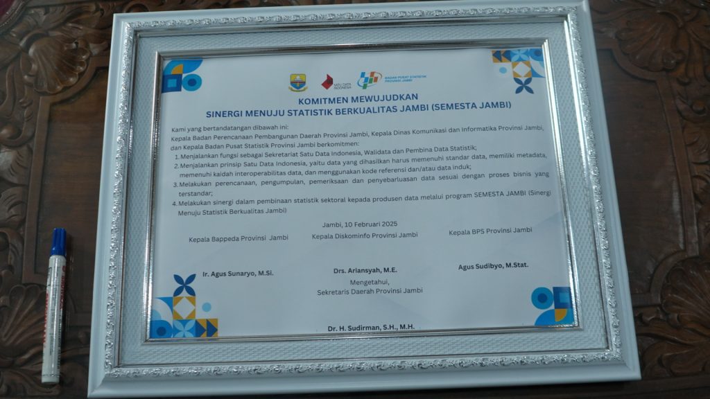 Penandatanganan ini dilakukan oleh Dinas Komunikasi dan Informatika (Diskominfo) Provinsi Jambi yang dihadiri langsung oleh Kepala Diskominfo Provinsi Jambi, Drs. Ariansyah, M.E, Kepala Bapedda Provinsi Jambi Ir. Agus Sunaryo, M.Si, dan Kepala BPS Provinsi Jambi Agus Sudibyo,M.Stat.